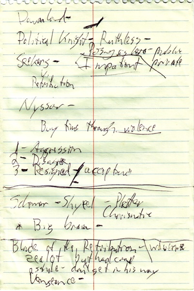 Character creation is one of the most important things we do. For major characters, I like to have a sit-down discussion with Matt. During this time, I take notes. As I will demonstrate, these notes serve mainly to keep my hands busy during the meeting; they become incomprehensible gibberish when I look at them later. This is why I have learned to type at about 100 words per minute. After these meetings, I head back to my computer and type a real summary of what we discussed.