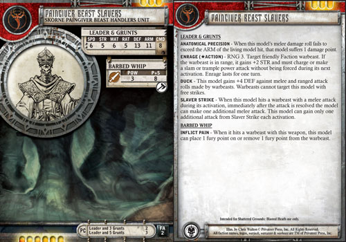The Blasted Heath season will cause Skorne players to ask themselves similar questions when all their Paingiver Beast Handlers turn into Paingiver Beast Slavers for three weeks. These Paingivers are significantly more effective at combating opposing warbeasts thanks to Duck and Slaver Strike, but their support capacity is slightly diminished with the loss of Medicate and Condition. When playing these guys, be sure to remember the combination of Anatomical Precision, Inflict Pain, and Slaver Strike have a net effect that is somewhat similar to the Condition ability, albeit at a cost. Then again, a little bit of a pain is a cost that is well in keeping with the Paingiver philosophy.