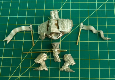 Here you can see the major components laid out. The Seneschal banners have been affixed to 1.90 mm brass wire, and I replaced the plastic Crusader loincloth with the metal one from the Fire of Salvation. I was even able to keep all the parts intact, so when it comes time to build the plastic Crusader, I can use its loincloth with the original metal hips from the Fire of Salvation. The attachment points on the legs were cut at an angle to create a wider stance.