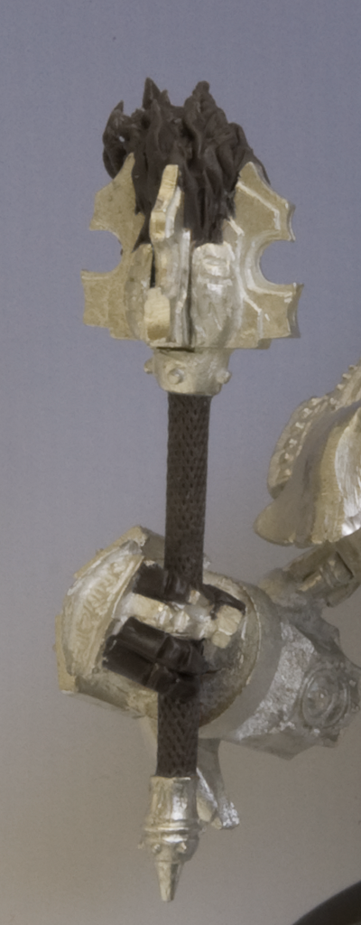The Absolver mace has been repositioned, angled out away from the Fire of Salvation’s body. I used brass rod covered with P3 modeling putty for the handle. The putty allows me to roll the part on a textured surface to create the knurling pattern. The mace head and end cap were then attached to the ends. The fingers were resculpted to fit the angle of the handle, and a larger flame was sculpted atop the Absolver.