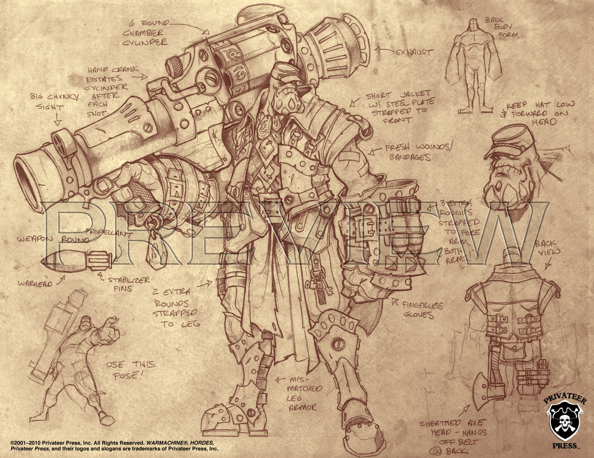 From his inception, we knew Gunnbjorn was going to be a trollkin with ex-military service. I had the image of a gung-ho US Marine drill sergeant who was out to kick ass and chew bubble gum. Since bubble gum doesn’t exist in the Iron Kingdoms, it left Gunnbjorn with only one thing to do. A lot of his look flowed from there.