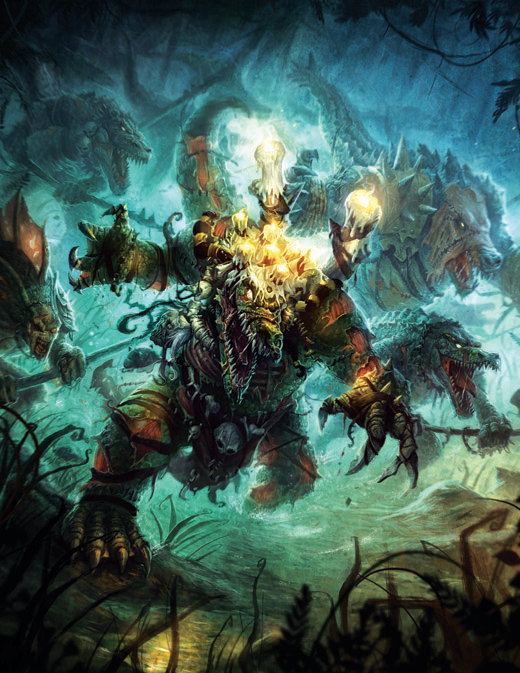 Let me present to you Maelok the Dreadbound, the new Minion Gatorman warlock. Maelok has been rendered out by one of our amazing artists, Nestor Ossandan. From what you can see in the background, Maelok has a number of powers that lend undead strength to his forces.