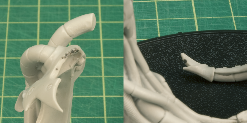 Once you have the main parts of the body cleaned, assemble the torso and the two tail sections. The torso sides connect to the central body and the upper tail section, so having one solid piece to fit them to will be far easier to manipulate than three parts that haven’t been assembled yet.