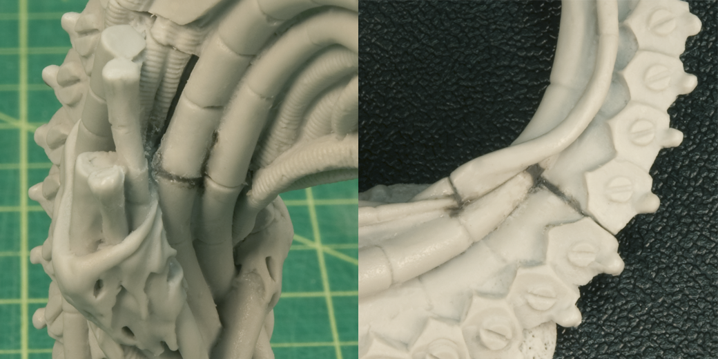 While the torso is assembled, it is a good time to fill any gaps that might be between the torso and tail sections. The connection point between the torso and upper tail will be mostly covered by the torso sides, so you could skip filling gaps in that area. The connection between the two tail sections is a bit more exposed, but if you take your time and follow the shapes of the pipes, you can eliminate any gaps easily.