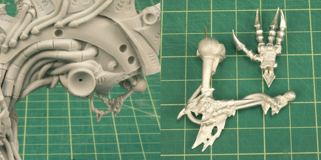 Now that all the parts have been cleaned and some have been assembled, it is tempting to complete the model. With the way the chest area is surrounded by the ribs, it will be far easier to paint the model in parts, and then assemble it once the interior sections have been painted. To keep the connection areas free from primer and paint, use poster putty or masking tape.