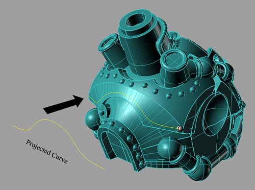 So let’s say the powers that be request a row of rivets on the bottom edge of the Man-O-War boiler. I would start by drawing a curve where I would want the rivets to be; then I would project the curve to the surface: