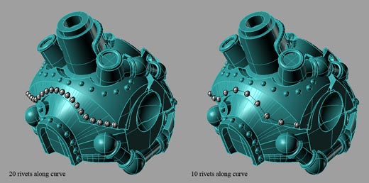 Once the projected curve is in place, I would create a sphere primitive at one end of the curve, which will be my rivet, and use the “array along curve” function to create as many rivets as needed along the given curve: