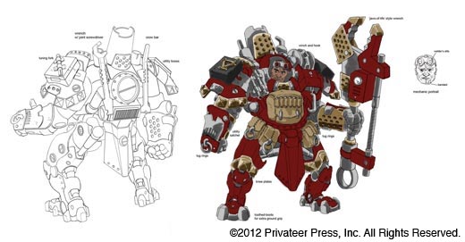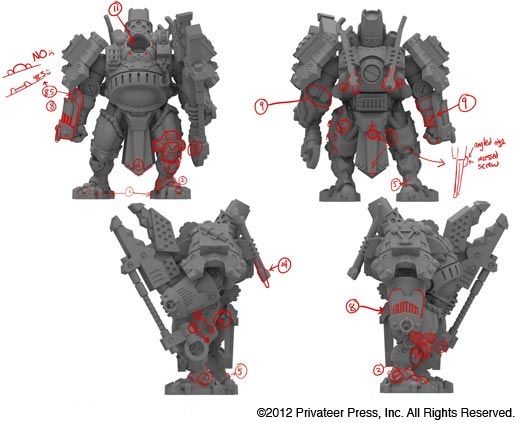 For example, I recently finished the Battle Mechanik Officer after four rounds of revisions. Listed below in order are the original concept, my first draft, notes from a round of revisions, and the final approved model. The head and pouches were sculpted later by hand.