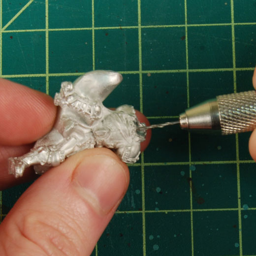 Once you’ve removed Magnus’ head, you don’t want to just glue the Officer Head in place (I learned that during the beta version of this conversion.) You’ll want to pin the new head into the old body, creating something of an artificial neck for the mini.