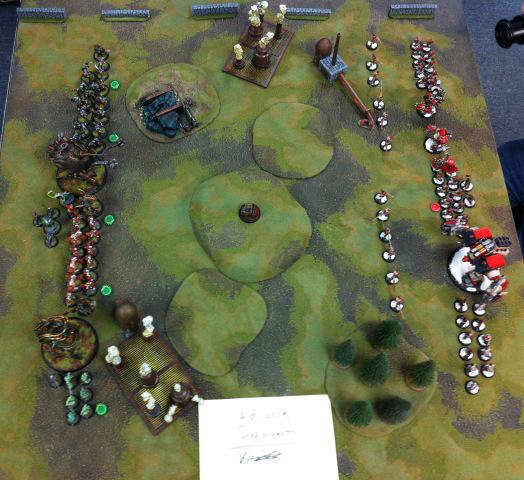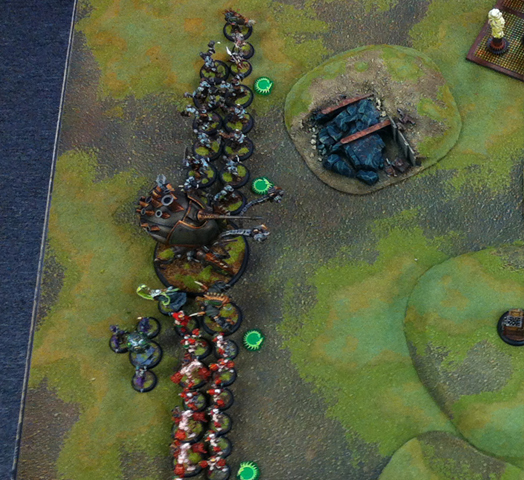 I was laying out the maps when I came across a hilarious bit of confusion. Looking at the army construction lists, I was putting each icon in place. Bloodgorgers? Check. Scrap Thrall? Check. Necrotech? Wait. Where’s the Necrotech? I couldn’t find him. I thought maybe he’ll show up in later turns, and I can work backwards from there…