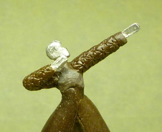 I wanted to do something a bit more interesting than plain cloth for his arms. We have a few models with studded cloth, so I decided on that. The example shown was made flat, but the same technique applies to a round surface, I found the hardest part was to keep the distance between the studs even so it doesn’t look messy.