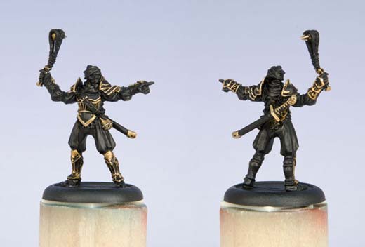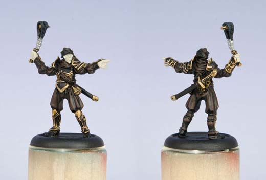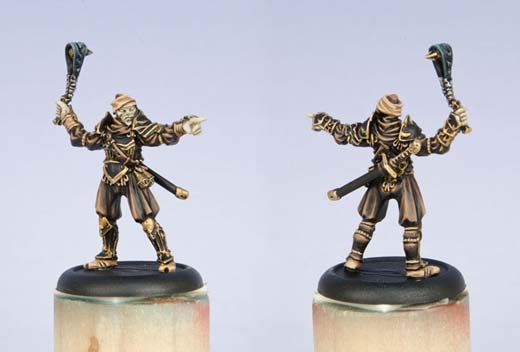 Whenever I start a new unit I always paint a single control model. This control mini is a single figure from the unit that I completely paint to my liking before I commit to the entire unit. To ensure I achieved the composition I wanted, I had to paint some smaller areas on this Venator Slinger several times before I was pleased with it. I tried a number of different approaches when painting the sling pouch, the ropes, and other smaller supporting areas. The major areas (black, gold, skin, and brown) are always painted the same way.