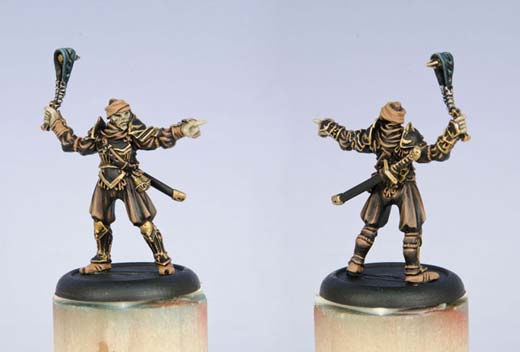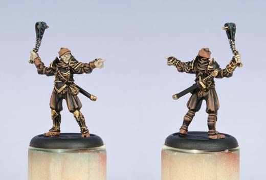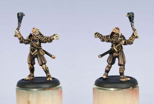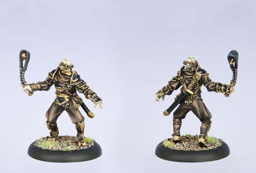 - Layer Umbral Umber for the brown areas while leaving some of the black as a shadow. Then use Cold Steel for the sling chain, Coal black for the sling pouch, and a 70/30 mix of Menoth White Highlight/Hammerfall Khaki for the skin tone.