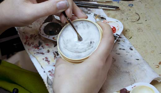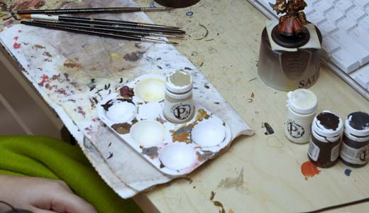 A: What I do is specific to Formula P3 paint pots. I shake the pot well before opening, which usually transfers paint into the well in the cap. Then, using an older brush that is well past it’s painting days, I dip the bristles in all the way and use a scooping action to get as much paint on the bristles as possible. Finally, I wipe the paint on the side of the well in my dry palette, add some water to the paint, and then I’m ready to go.