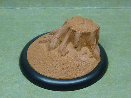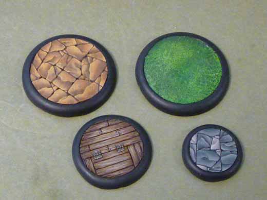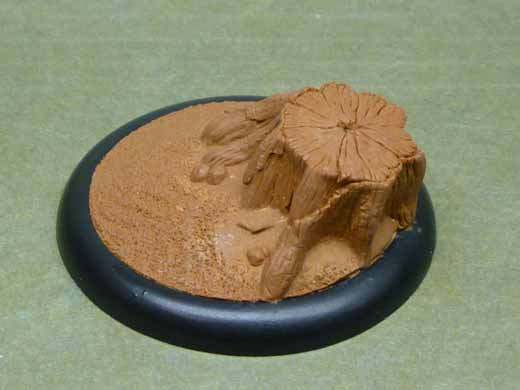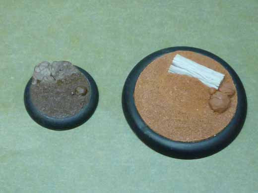 The first two bases are just plain grass, very easy to make with a toothbrush. I think this technique looks more like real grass than slapping some green paint on sand or model gravel. You can get more realistic results if you make small depressions in the grass to simulate uneven ground or a small hill on larger bases.