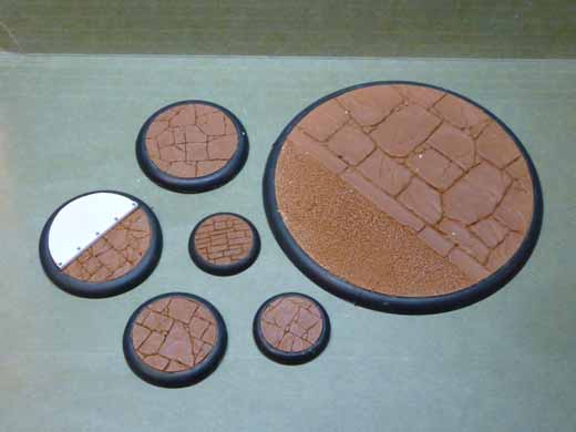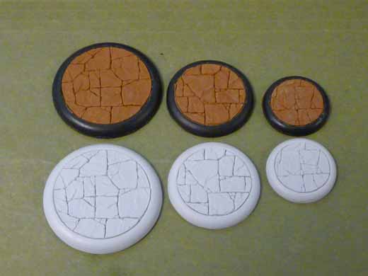 Next, I made some cobblestone and irregular flagstone bases, again using just polymer clay, a knife, and a sculpting tool. Polymer clay is a great material to work with. It has an unlimited working time and is very inexpensive compared to two-part epoxy putties. That working time comes in handy when you need to cover something as large as a 120 mm base.