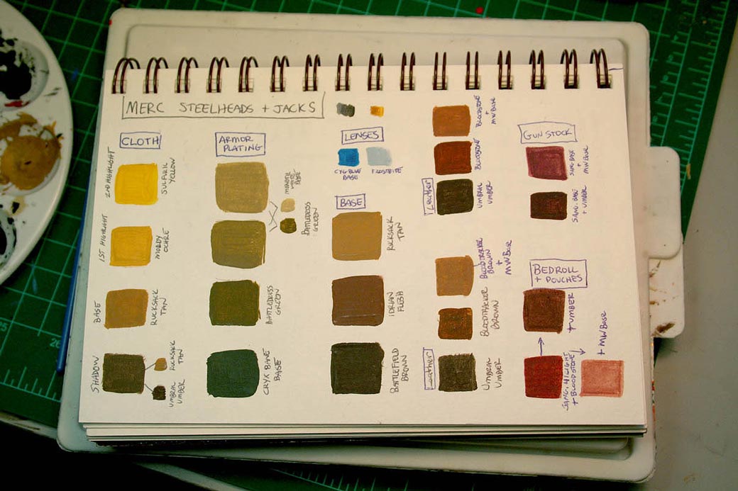 I’ve started keeping a recipe book of the paint mixtures and color schemes I use for each model so I can refer back to it as I add more models to the army. Here’s my page for the Steelheads and Mercenary warjacks.