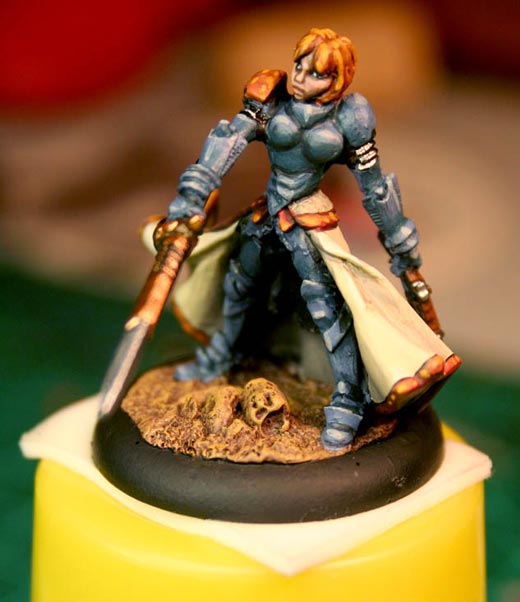 I really wanted to make Ashlynn stand out, so instead of earth tones I chose colors that help make her pop a bit more on the tabletop. Her blue armor is a combination of Greatcoat Grey, Coal Black, and Frostbite, with Menoth White Base mixed in for highlights. I went with fiery red hair rather than the traditional blonde because the red-orange color is a nice complement to the blue armor. I also added some orange dots for texture around the red fringe of her waist cloak. I liked the effect so I repeated it on her right shoulder pad.