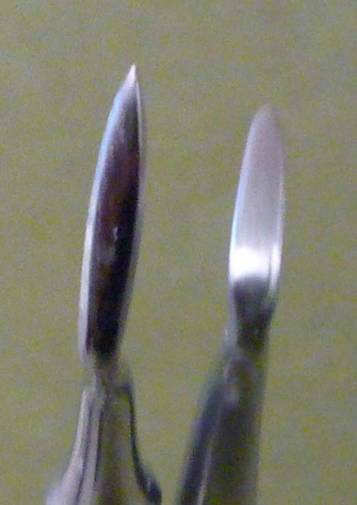 To make my version, I used files and sanding sticks to shape and round out the tool tips and then bent them at a sharper angle with a pair of pliers. Then I used scouring pads to buff out the tool marks and polish the surfaces. Here you can see the original tip on the left and the modification on the right. I wanted a much rounder sculpting surface.
