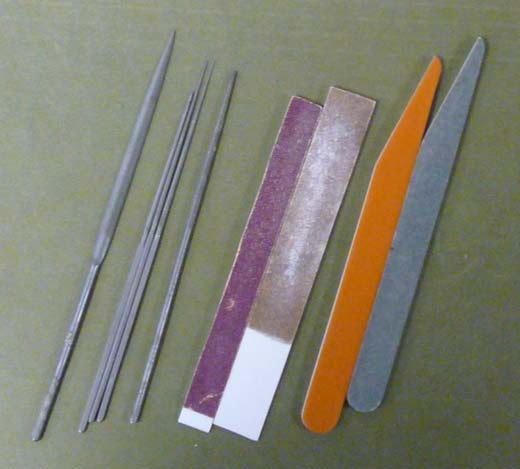 Another tool I use frequently are sanding sticks. You can buy pre-made ones like those shown on the left in this pic, but the variety of grades they come in is pretty limited. I frequently make my own (shown in the middle), which is also much less expensive.