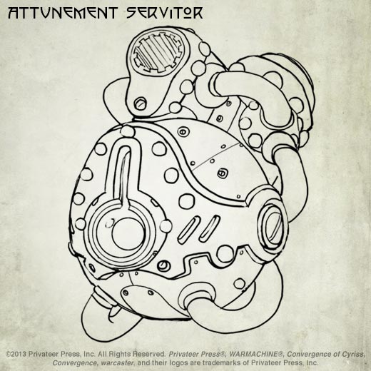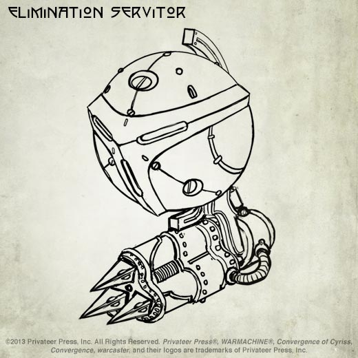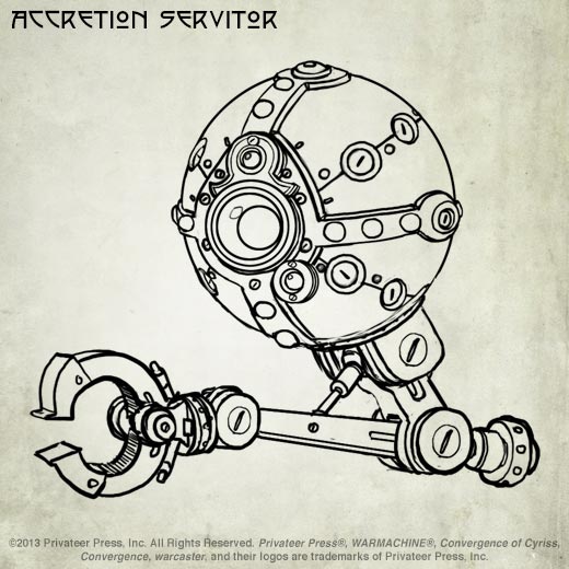 The first of the various servitors to be concepted were the Accretion Servitors. Used in the foundries and workshops of Convergence temples, these constructs are designed for repair. While not capable of making extensive repairs like the Galvanizer, it’s a mistake to underestimate the power of the Bodge ability—especially given how many of these little guys you can bring to the table. While the Accretion Servitor would be a welcome addition to any WARMACHINE faction, their inclusion in an army whose primary troops are also repairable constructs is absolutely amazing. Throw in a new special action called Strip, which allows the Accretion Servitor to deal 1 point of damage to the column of your choice to an enemy warjack in base-to-base contact, and the Accretion Servitor is a cheap support solo with some serious impact in the mid- to late-game.