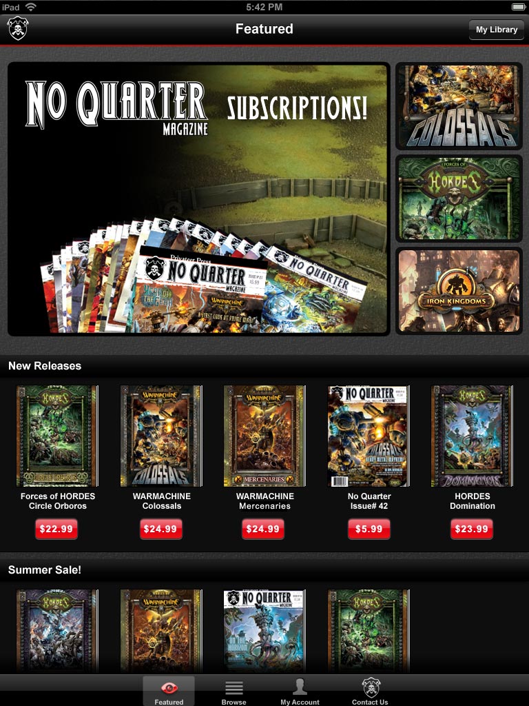 With Privateer Press Digital, you have access to an extensive catalog of No Quarter magazine issues, WARMACHINE and HORDES rulebooks, Iron Kingdoms Full-Metal Fantasy Roleplaying Game material, and much more! Take your Privateer Press rulebooks with you wherever you go for quick, easy reference. Download the latest No Quarter magazine straight to your device. Privateer Press Digital is the ultimate reference tool for the Privateer Press gamer!