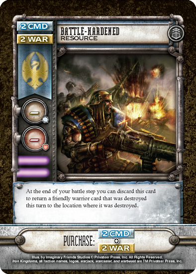 Will: DC said it first, but I’ll echo it here: Battle-Hardened is a high commander’s best friend. The applications for this card are really endless. My favorite ploy is to drop a Stormblade Platoon on a location where my opponent has three cards with at least one of 3 Health or less. Thanks to Battle-Hardened, even in a situation where my Stormblade Platoon might be destroyed, leaving my opponent with enough cards to still capture the location on his turn, playing Battle-Hardened puts them right back in the action and blocks him from capturing to boot!