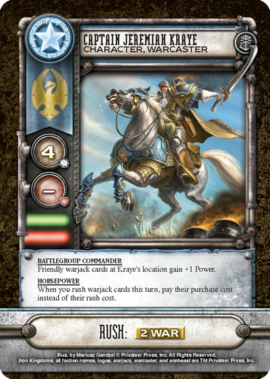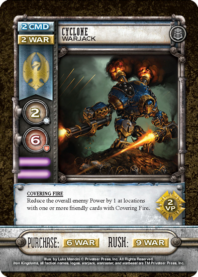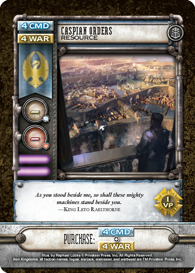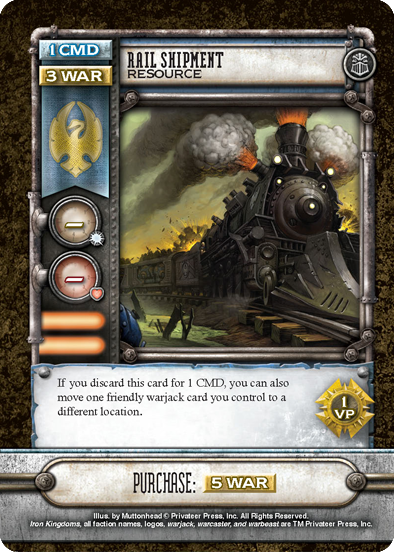 Will: Since I prefer to play the long game, for me it’s all about grabbing the right resource cards as early as possible. With four Caspian Orders in the reinforcement deck and two Rail Shipments, you should always find yourself with some solid resource cards to purchase in your first couple of turns. Use lower-cost cards like Journeymen Warcaster and Lancers to slow down your opponents’ attempt to capture locations early while you build up your army deck. And remember that even your heavy warjack cards make great resources with their 2 WAR resource values, allowing you to really build up an iron-and-steam blitzkrieg machine! By the time the Mid-war cards start showing up in the Winds of War deck, you should have no problem dropping a ’jack or two a turn on a location.