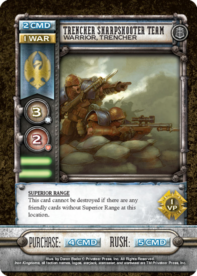 DC: Whichever warcasters and detachment colors I choose in a given game, I really like to set up powerful, synergistic card pairs in Cygnar. For example, a good pair to deploy to take a location is the Cyclone with a Trencher Sharpshooter Team. It has sufficient Power to defeat the vast majority of cards in the game and requires a hefty 7 Power on the opposing side to destroy any Cygnar cards. When looking to oust an enemy rather than take a location, a Journeyman Warcaster with a Charger is good for 5 (or even 6) Power at a cost of just 3 CMD and 3 WAR.
