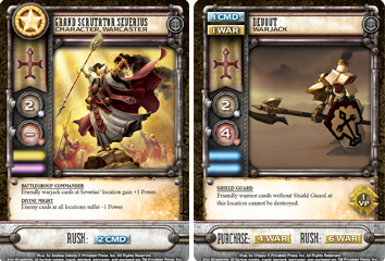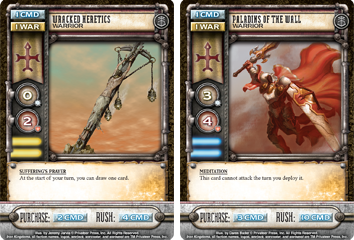[DC] Much like in WARMACHINE, timing is a key element to successfully playing the Protectorate of Menoth. You typically want to buy low purchase-cost, high rush-cost cards during the first few turns, play aggressively to capture locations in the following turns of the game, and then prevent your opponent from overtaking your lead during the late game.