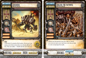[Will] When playing the Protectorate, my focus is always on the mid-game. With my deck’s combination of detachments the majority of non-resource cards have a Purchase (and more important Deploy) cost of 4 or less. With the mix of cards from my detachments it’s not unlikely to be able to deploy two or three cards a turn, starting with the fourth or fifth turn. While pushing for locations is important, your low purchase costs also allow the Protectorate the ability to deploy and purchase multiple cards in the same orders step. Also, while Temple Flameguard Phalanxes and Holy Zealot Mobs are great in the early and early mid-game, even together they will find themselves hard pressed to overcome late-game fighters like Juggernauts and Titan Gladiators. While other factions might suffer from this, Forging the Faithful lets you move those cards to your occupying forces pile fast and often, meaning you’ll be drawing your durable warjacks and warriors far more frequently to maximize every turn and hold back late-game-centric decks from overtaking your mid-game established lead.