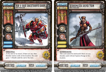 The four Widowmaker Sniper Teams are key components to the deck and well worth the 3 (or 5) CMD. Behind a red-detachment warjack or some Shocktroopers, they provide an efficient attacker positioned to capture a location or destroy opposing cards without losses. The fact that they’re also worth a victory point makes them perfect for a backup plan of purchasing enough VPs to compete with faster factions’ decks.