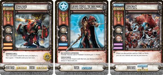 Will: While you continue to press your opponents with low-cost troops in the early game, by mid-game you should have built up a stock of resource cards like Supply Convoy and Kommandant’s Authority in preparation to unleash your iron assault! Kodiaks and Demolishers are extremely resilient warjacks with very reasonable rush costs. And that’s before you factor in Vlad’s Forced March ability, which allows you to rush warjacks to his location for their purchase cost. 4 WAR rushed Demolishers? Yes, please!