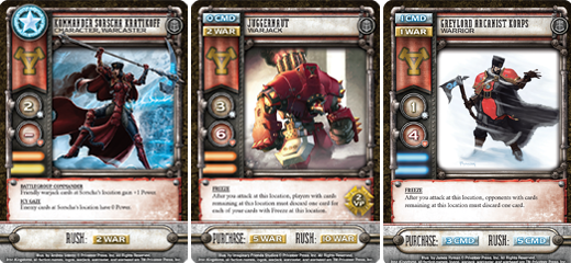 DC: We also cannot conclude a discussion about Khador in High Command without talking about the potential behind a frost deck. We’ve already mentioned some of the cards that are the key components to such a game plan, but stacking these effects together allows you to apply continuous pressure to an opponent. Just remember that the goal of a Freeze-focused game plan does not require you to destroy all of an opponent’s cards, but rather to slow your opponent’s development to a crawl via turn-after-turn discard. Such a strategy is less viable in free-for-all games but serves as a powerful supplement to a conservative slow-grow play style.