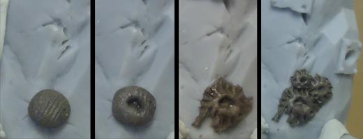 I start by rolling out a small ball of putty and placing it on my work surface. Then I wet the tip of my hobby knife and make a circular indentation in the ball. The last step is to take a wet hobby knife and pull small cuts radiating out from the center of the hole to give the ball texture and imply that it is attached to the surface of the rock. Barnacles look best when clustered together in uneven configurations so I repeated the steps above to make a barnacle triad.