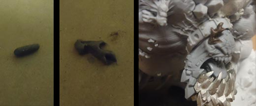 I started this project with the venerable Formula P3 Modeling Putty but switched to P3 Brown/Aluminum Putty when it became available. I need to crank out some simple barnacles en masse, so their shapes need to be simple and easy while still being recognizable.