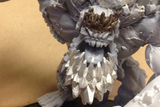 The consummate concept artist Nick Kay suggested that my Sea King needed a crown of coral, so I had to oblige. I started by rolling out a small tube of putty. I pulled a few branches away from the putty with my sculpting tool until I had a rough coral shape, which I scraped off of my work surface and affixed to my Mountain King’s noble brow. I repeated this process, overlapping my coral branches a bit until I had the basic shape of a crown.