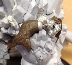 It wouldn’t be a Trollblood model without a touch of humor, so I decided to sculpt a Mer-whelp to pose seductively on the Sea King’s shoulder, luring poor unfortunate sailors to their doom with its whelpy wiles. I sifted through the included whelps and found a suitable model to work from. After hacking its legs off I sculpted a rotund tail fin, a full head of luxurious whelp-locks, and finished it off with a seashell brassiere.