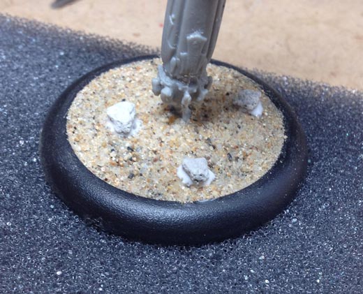 After the model has been fully assembled, glue on some modeling sand. To show a little more variance in the bases I added a few pieces of ballast used for model trains. I prefer to base my models before painting them, as the primer will assist in holding the basing materials to the model. After everything is dry, it’s time to base the model using P3 Primer.