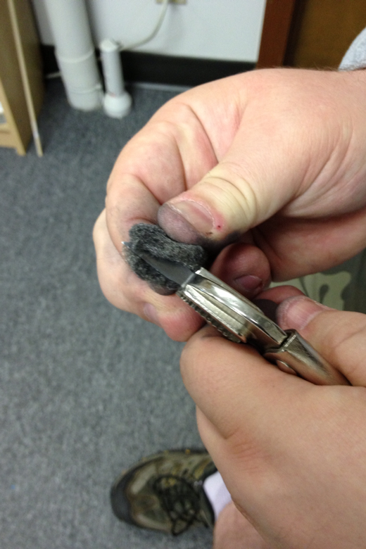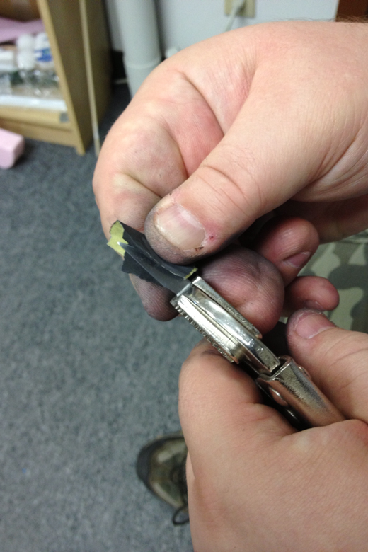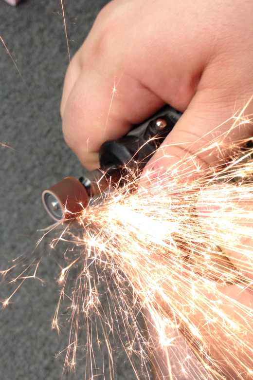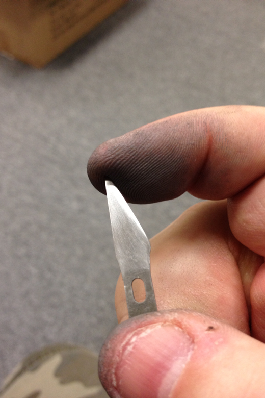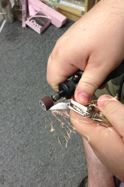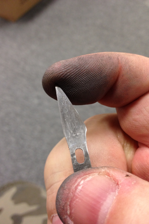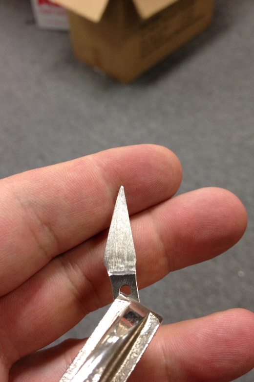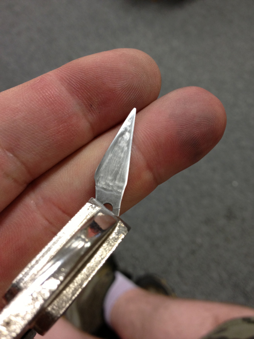 I start by taking a normal P3 hobby knife blade and a pair of vice grips. I lock the pliers so the blade is held securely, giving me sufficient room in which to work. Using a rotary tool and a sanding drum (use safety goggles!), I take off the sharp edge, dull the tip, and remove the kink on the back edge of the blade. Essentially, I remove the surface of both sides of the blade.