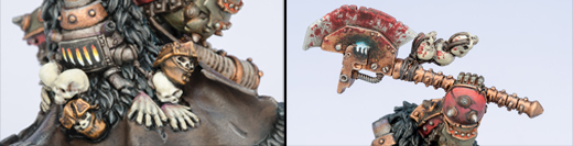 For those who followed the WARMACHINE: Tactics Kickstarter, you might remember Update #32 mentioning Extreme variants of the warcasters. I loved the idea of the “Red Rage” Butcher, an even more ferocious take on an already berserk character. To turn up the intensity, I added additional decapitated heads and skulls. Likewise, I sculpted several grisly trophies, such as severed hands and a necklace of human ears.