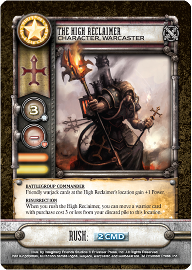 With the upcoming release of WARMACHINE High Command: The Big Guns comes a new update to the Kingmaker rules, and a very special prize card for this month’s Kingmaker tournaments. Don’t miss out on your chance to win the alternate art High Reclaimer card, available at Kingmaker tournaments held at a gaming store near you! Also be sure to download the updated version of the Kingmaker rules set, which now includes the card allowance chart for the Big Guns expansion.