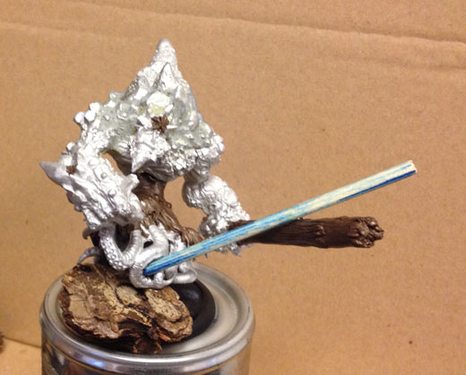 Next, I snapped an old paintbrush in half and laid it across my makeshift mast. I also covered up some of my sloppy joins with sheets of putty to make it look like Mulg had clothed himself in scraps of sail—after all, Trollkin vanity is second only to Trollkin ferocity.