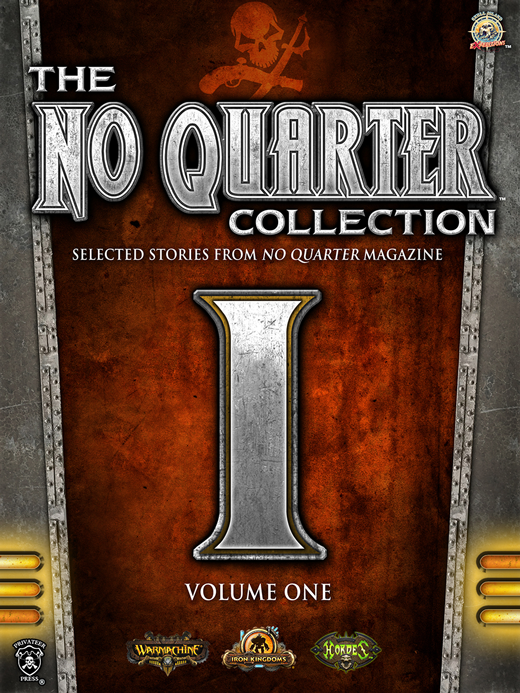 The No Quarter Collection: Volume One is now available from Skull Island eXpeditions! Packed with tales from the pages of No Quarter magazine—some long out of print—this collection takes you across the continent of western Immoren and beyond. Join warcaster Phinneus Shae as he leads the mutiny that transforms him into an infamous pirate; travel down a cold and lonely road with a group of Illuminated Ones as they escort a most dire cargo, the ancient necromantic blade known as the Witchfire, to a place of safekeeping it may never reach; and delve into the mind of an Iosan soulless whose terrible curse proves to be the salvation of his fellow countrymen.