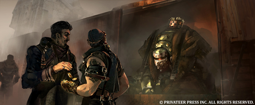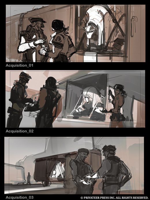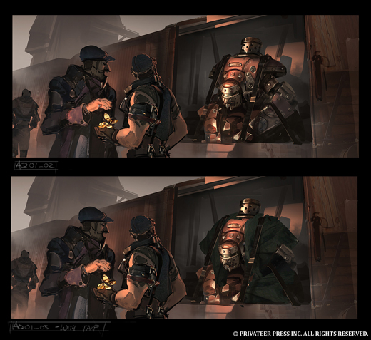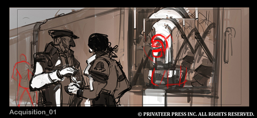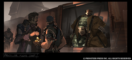 With new art coming in all the time, this is a great opportunity for me to walk you through the process of creating a new illustration for the Iron Kingdoms. This particular image, featuring a shady business deal with a Talon warjack being sold to a mercenary group, is for No Quarter #53.