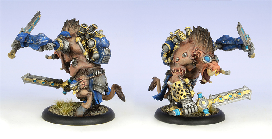 Axes aren’t really as Cygnaran as, say, voltaic swords, so I liberated a pair from a Stormclad and an Avenger. The Stormclad also donated its left arm, smoke stacks, and boiler. I added a few other little details in there, too. Cyg-pig’s tusks are shorter than his Khadoran friend’s and he’s rocking a sweet pair of goggles. He also has a Centurion head as a trophy on his flank instead of a Khadoran Juggernaut’s.