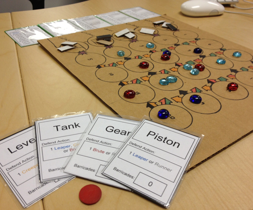 There were also plenty of things that stayed the same. The game board is remarkably similar to the playtest board I originally drafted, the names of the zombie types remained consistent from the initial rough prototype to the final game, and even the deck of Terrible Things kept its goofy name all through playtest and into the final product.