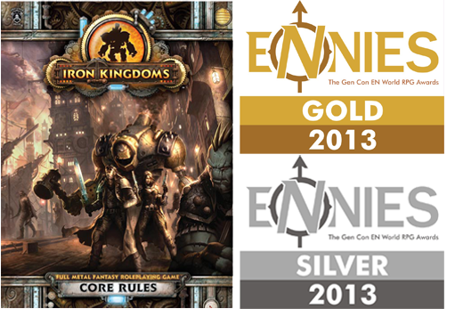 The Iron Kingdoms Full Metal Fantasy Roleplaying Game: Core Rules took home four ENnies from the prestigious Gen Con EN World RPG Awards ceremony! The Core Rules won gold in the categories for Best Game and Best Cover Art, and claimed silver in the categories for Best Rules and Best Production Values. The ENnies are “people’s choice” awards voted on by gamers. We thank you for your support!