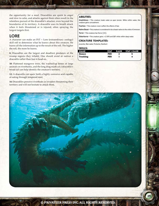 While writing the rules for the new Monsternomicon, we looked at what the creatures were able to do in the past (trimming away any superfluous skills they might have picked up along the way) and combined this with our new understanding of them as realistic animals to distill rules that reflect their place in the Iron Kingdoms. Early on, we started adding Sneak and Detection to anything described as an ambush predator, while more aggressive and active hunters typically wound up with pretty decent Tracking skills. As we wrote the rules, we had to keep in mind the upcoming release of Iron Kingdoms Unleashed, and ensure each creature worked within the constraints of both Full Metal Fantasy and Unleashed.
