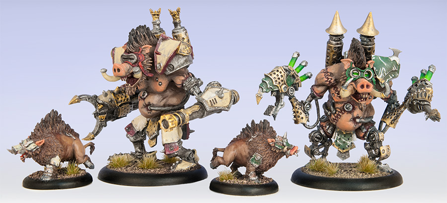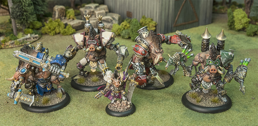 Last but not least, here’s a group shot of Carver with his faction-themed beasts! It goes without saying, none of these big piggies are tournament-legal, but if you’re in it for the casual games and some extra crazy hobbying, I think you’ll find our farrow friends take very well to some ’jack-inspired conversions.
